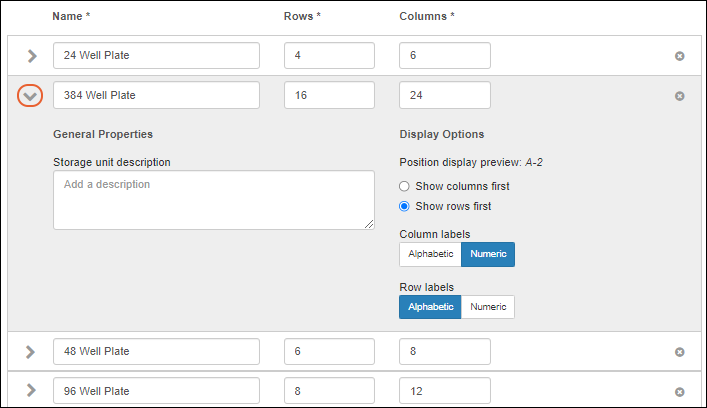 These built-in plates use a default of alphabetic row labels and numeric column numbers, and by default display rows first, i.e. A-1. All of these default attributes can be edited for the built in plates, or you can add a new type of plate with different attributes.
