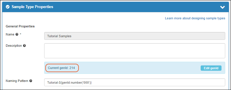 | genId | An incrementing number starting from 1. This counter is specific to the individual Sample Type in a given container. Not guaranteed to be continuous. | Current Sample Type |