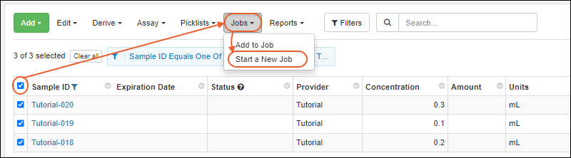 - Select "Tutorial-018", "Tutorial-019" and "Tutorial-020". (A spreadsheet with some assay data for these specific samples is included below.) First clicking one label, then clicking the other two checkboxes is one quick way to accomplish this.
