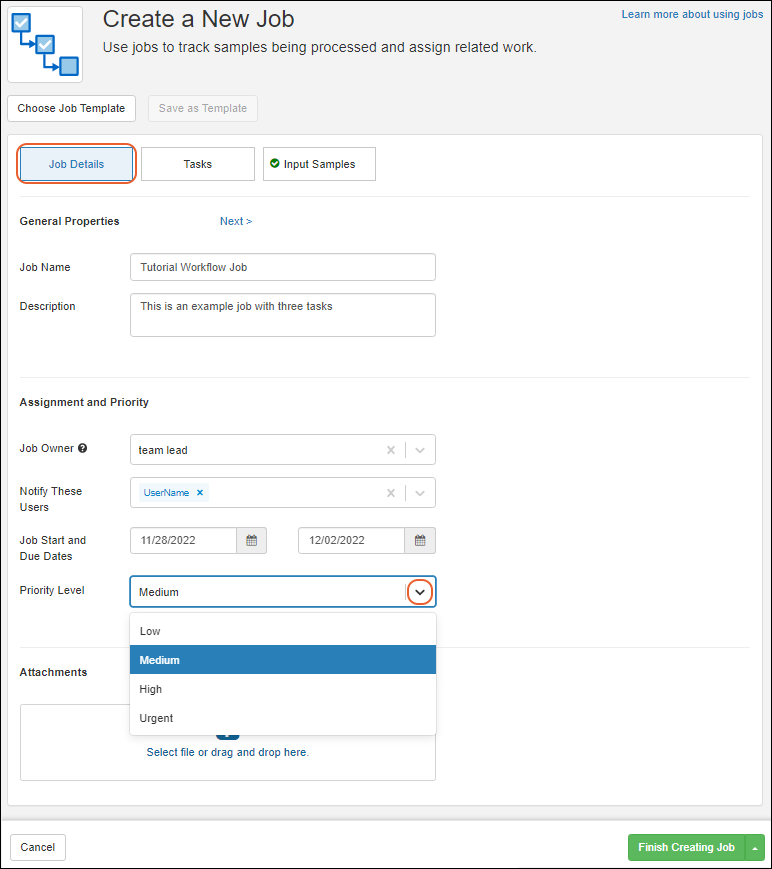 - Attachments: For this tutorial, you can ignore this field. In practice, you could upload a protocol document, detailed instructions, label image file, or any other file attachment required for the job.