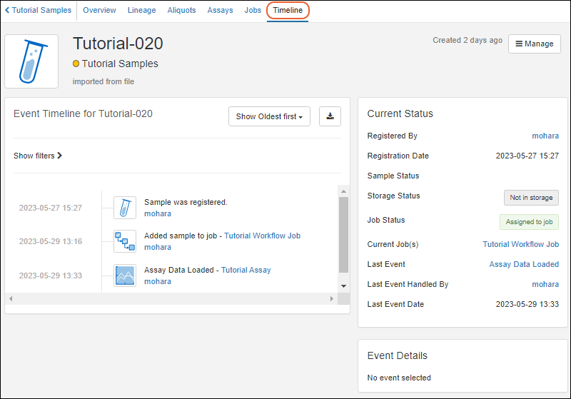 - You'll see when it was created (registered), when it was added to the job, and when assay data was uploaded for it.