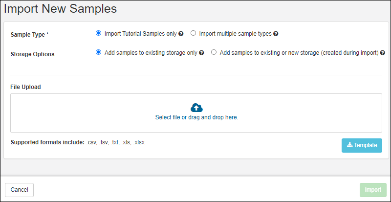 Once you have defined the Sample Type for your samples, you can import them by typing directly into a grid, bulk entering values, or by importing a spreadsheet of sample information, as used in this tutorial.
