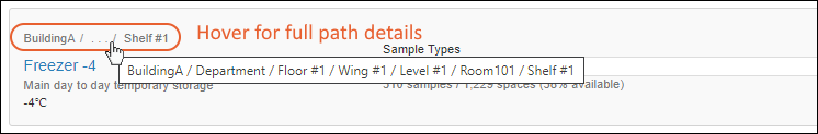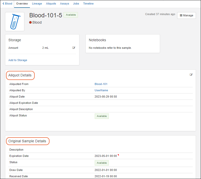 Overview: basic details including the values of all sample properties and fields as well as the storage location (if any)