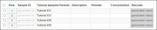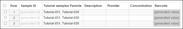 The generated Sample IDs for each row may vary if other samples have already been created on your system.