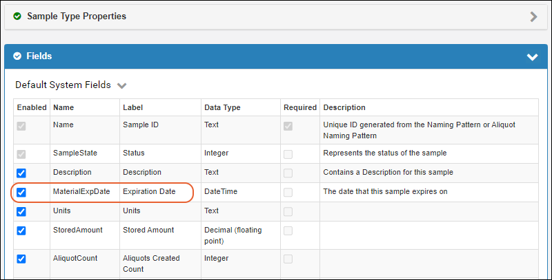 You'll see Default System Fields that are automatically included in every Sample Type.