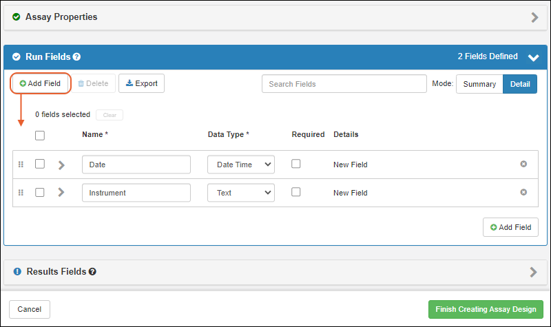 You could also manually add results fields, which will be different for each row of data within a given run, but in this tutorial, we will infer them from an example spreadsheet.