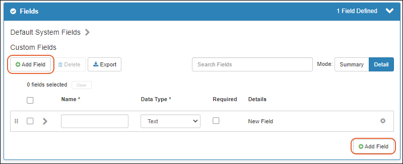 Click Add Field to add each of the fields shown below and select the Data Type shown: