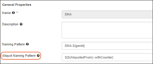 Aliquots can be generated from samples using LabKey Biologics and Sample Manager. As for all samples, each aliquot must have a unique sample ID (name). A custom Aliquot Naming Pattern can be included in the definition of a Sample Type. If none is provided, the default is the name of the sample it was aliquoted from, followed by a dash and counter.