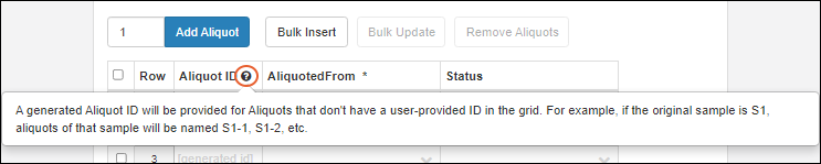 By default, the name of the aliquot will use the name of its parent sample followed by a dash and a counter for that parent’s aliquots.