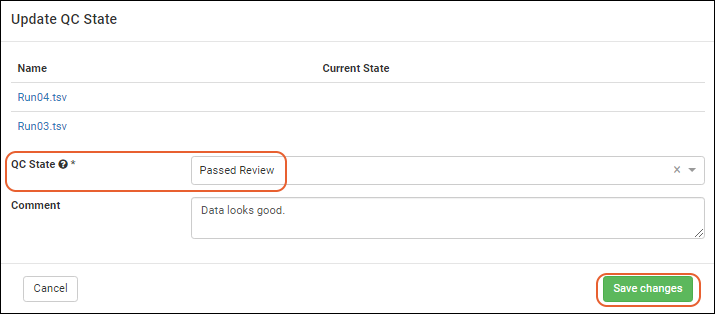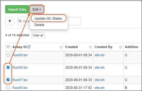 Once QC states have been configured in the system, users (with the appropriate roles) can assign those states to assay run data. Users can update QC states in the following cases: