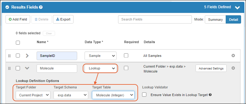 Lookup that points to the desired Entity/DataClass. For example, the screenshot below shows how to link to Molecules.