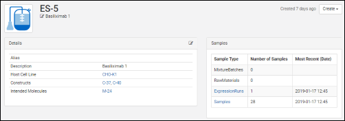 All details pages can be configured to show the most relevant data. For example, the details page for a protein sequence shows the chain format, average mass, extinction coefficient, the number of S-S bonds, etc., while the details page for a expression system shows the cell lines, constructs, and target molecule, as well as the samples drawn from it.