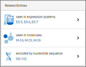 Each details page contains a panel of relationships to other entities. For example, for a given protein sequence, the relationship panel shows: