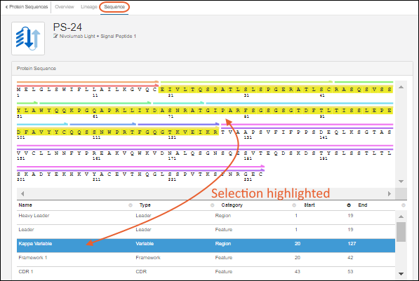 classification and annotation engine, which calculates their properties and identifies key regions on the protein chain, such as leader sequences, variable regions, and constant regions. (Researchers can always override the results of the classification engine, if desired.) Results are displayed on the Sequence tab of the protein's detail page. Identified regions are displayed as multicolored bars, which, when clicked, highlight the annotation details in the scrollable section below the sequence display.