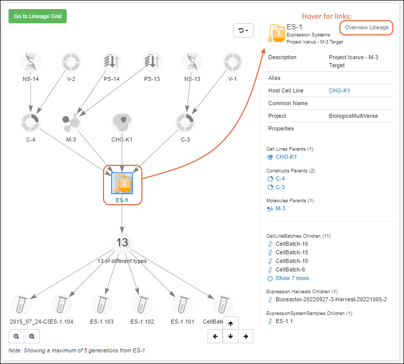Go to Lineage Grid to see a grid representation of lineage. The grid view is especially helpful for viewing lengthy lineages/derivation histories. Control visibility of parents and children in the grid view using