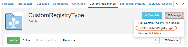 - Select the custom type to delete from the Registry section of the main menu.