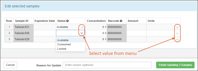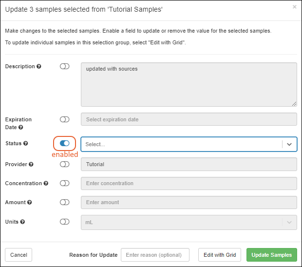 In the update panel, click the slider to enable the fields that you want to assign the same value for all the selected samples. Hovering over the