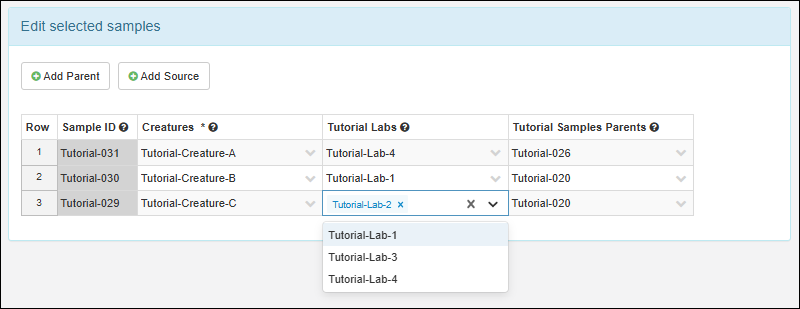 - To add a new parent or source association for these samples, click Add Parent or Add Source, select the desired type for the new association, then select values for the rows in the new column that will be added to the grid.