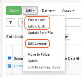 This topic describes how to edit the details and lineage for multiple samples either in a grid or with bulk setting of chosen fields.