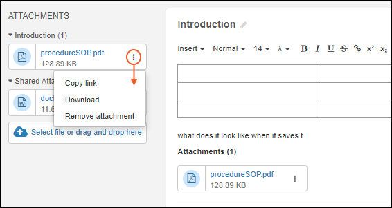 - Copy link: Copy a link that can be pasted into another part of an ELN, where it will show the attachment name already linked to the original attachment. You can also paste only the text portion of the link by using CMD + Shift + V on Mac OS, or CTRL + Shift + V on Windows.