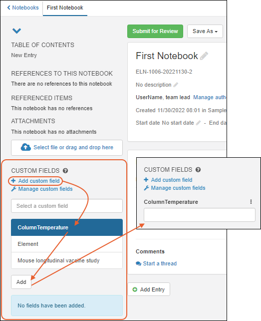 Add custom field to select an existing field to add to this notebook. Type ahead to narrow the list of existing fields to find the one you want. Shown here, the "ColumnTemperature" field is added and you can now provide a value for this field for this notebook.