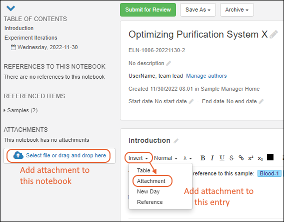 Attachments, such as image files, protocol documents, or other material can be attached to the notebook.