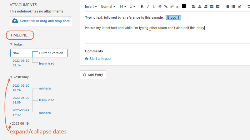 Many users can simultaneously collaborate on creating notebooks. Individual notebook entries are locked while any user is editing, so that another user will not be able to overwrite their work and will also not lose work of their own.
