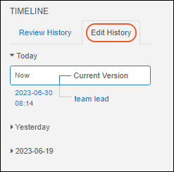 expanded detail panel on the left. Versions are saved to the database during editing at 15 minute intervals. The last editor in that time span will be recorded. Past versions can be retrieved for viewing by clicking the link, shown with the date, time, and author of that version.