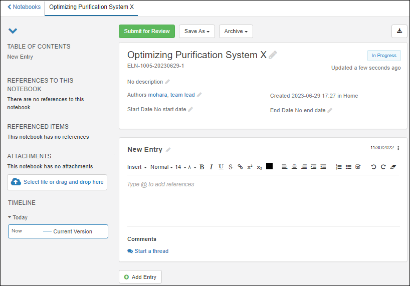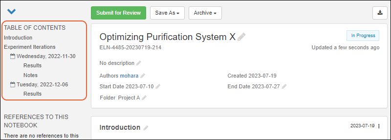 Table of Contents, references (both to this notebook and from this notebook to other entities), attachments, and includes an edit history timeline. On the right, the header section lists the name and ID, the authors, shows the tag (if any), creation details, and status. A new empty notebook looks like this: