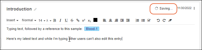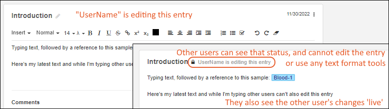 Other users looking at the same entry at the same time will be prevented from editing, and see your updates 'live' in the browser. A lock icon and the username of who is editing are shown in the grayed header while the entry is locked.