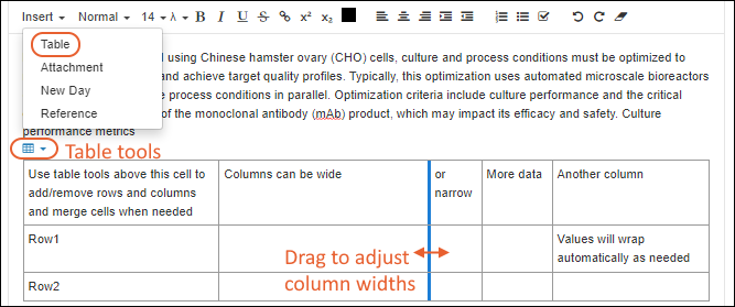 adding a table to an ELN, you can use the