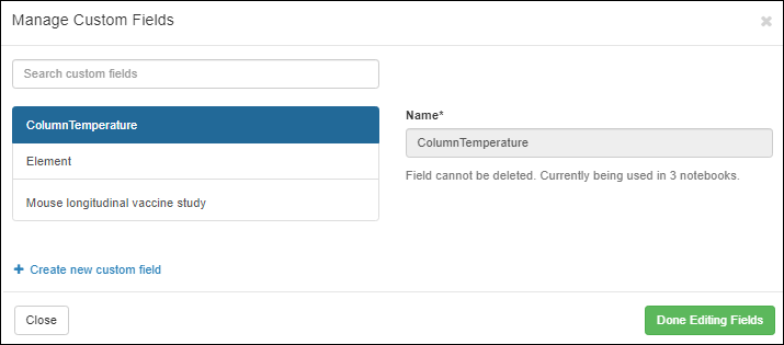 Manage custom fields. In the popup you can see the existing defined fields and how many notebooks are currently using them. Here you can also add new fields, and edit or remove any fields not currently in use. Click