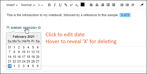 delete icon. Click the day to open a calendar tool, letting you choose a different date. Record activities for that day below the marker.