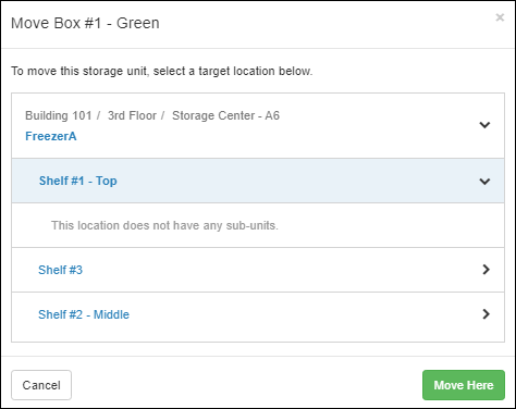 - Locate the storage unit you want to move. Shown below, Box#1 - Green" used to be on Shelf #2/Rack #1 and is being moved to Shelf #1.