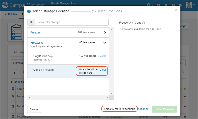 When selecting new storage locations for a selected group of samples, the same interface applies to adding samples to storage originally, in which if you select a new location that doesn't have room for all the samples you are moving, you'll be prompted to continue selecting additional locations for the remaining samples. Learn more in this topic: