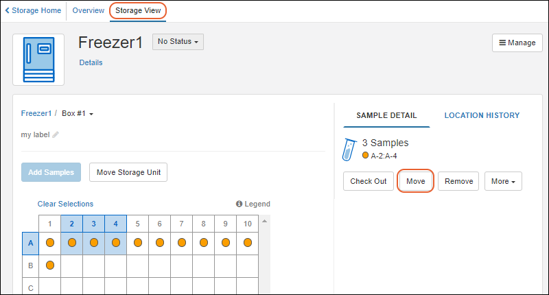 click the current storage location to begin the move from the Storage View, making it easier to move the sample to another position within a given storage unit.