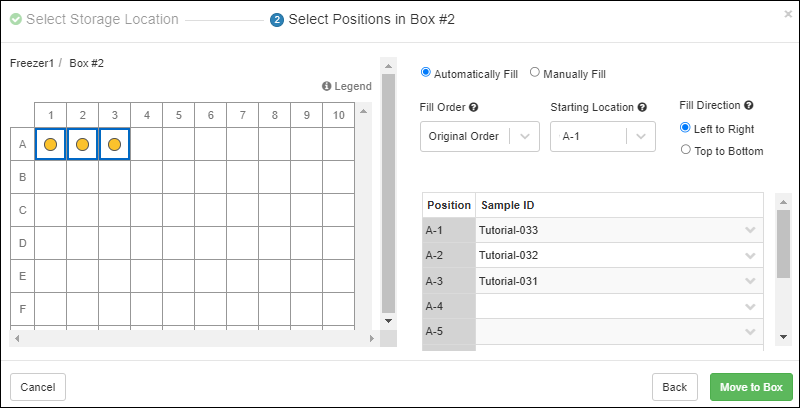 manually or automatically placing samples (choosing fill order, starting position, and fill order) are the same as when adding samples to storage originally. The default fill order is to use the