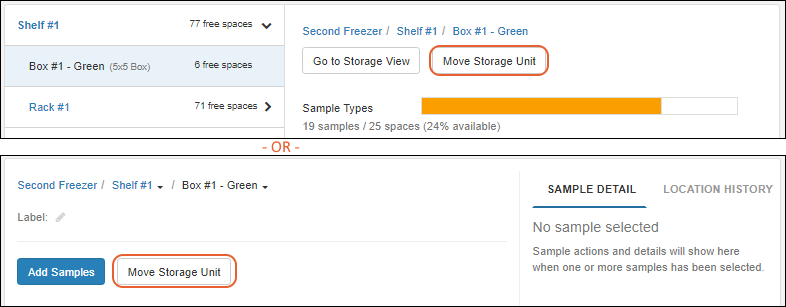 - If you move a storage unit containing samples, any samples it contains will stay with the same position assignment(s) within the storage unit.
