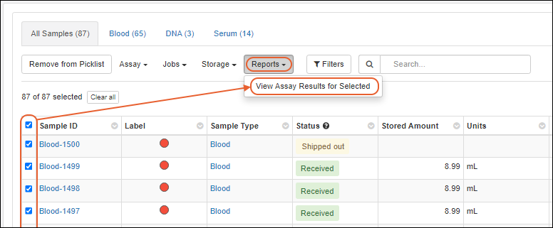 From a grid of samples, including tabbed grids showing multiple sample types like picklists, you can select desired samples, then choose