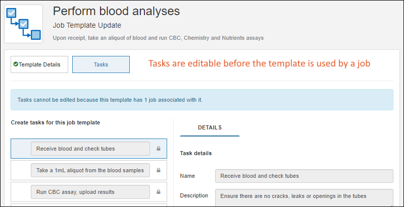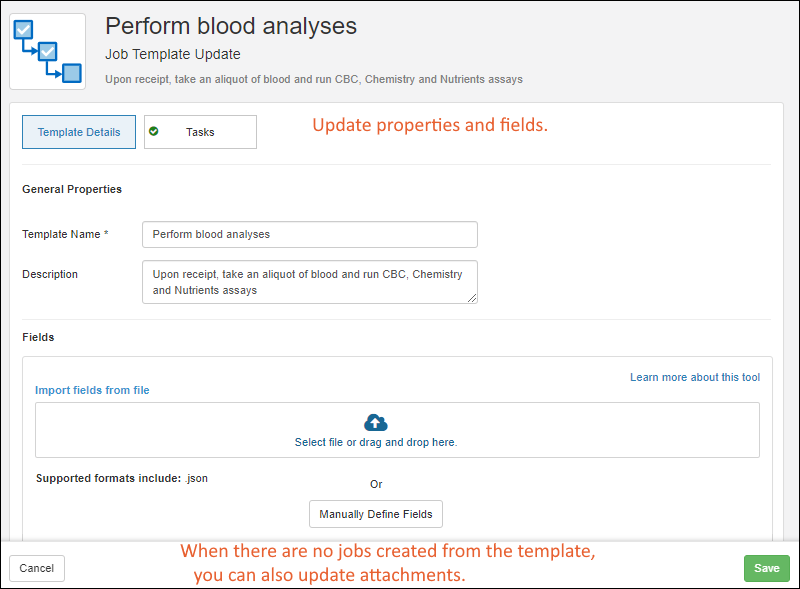 Attachments panel where you can edit or add attachments. On the second panel of the editing wizard, you can also edit the tasks, letting you iterate and have others review a template before use. Once a template has been used to create a job, you cannot edit the tasks (or attachments) and will see a blue banner indicating this.
