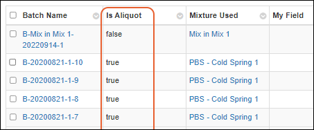 Go to Mixture Batch Creation Grid. Aliquots of mixture batches will be shown in the same grid as the original batch(es). Include the