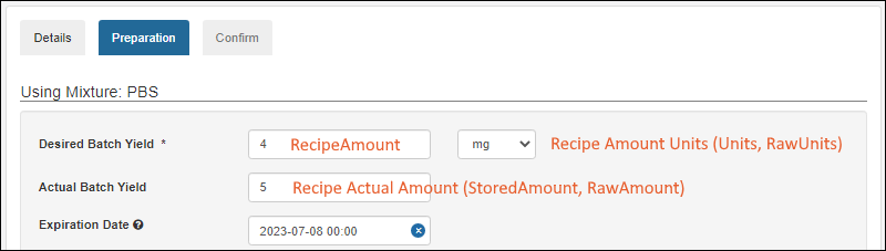 - Recipe Amount (RecipeAmount) : The amount, i.e. "Desired Batch Yield". This value is stored as a property on the run that created the batch. Note that this field is not editable as it is not a property of the batch.