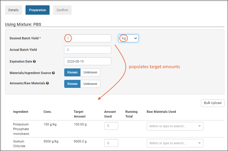 Enter the exact amounts of which raw materials were used to create the mixture recipe. (If ingredients and/or amounts are unknown, see options