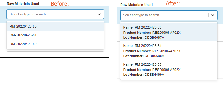 For example, if you define "Product Number" and "Lot Number" as identifying fields, they will appear for users with the "Name" of the raw material.