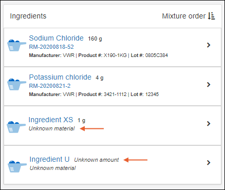 If additional ingredients were added to the batch, these modifications from the mixture recipe will be noted in a panel: