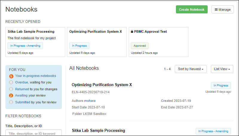 Notebooks Home on the home page of the application. Your own notebook work is highlighted and linked from both the home page and notebook dashboard, making it easy to find and complete assigned tasks.