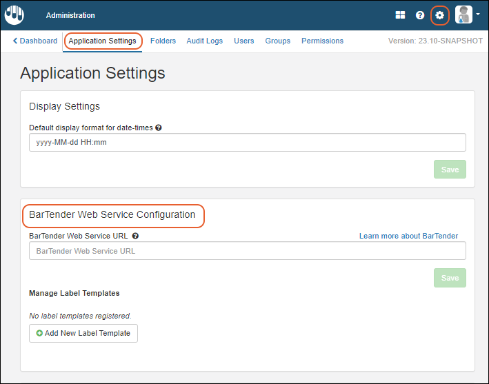 Return to the LabKey application (Sample Manager or Biologics LIMS) and select > Application Settings.In the BarTender Web Service Configuration panel, enter: