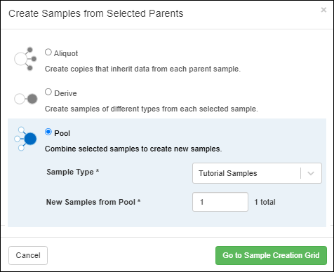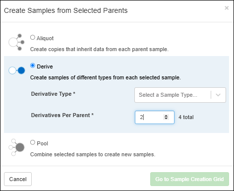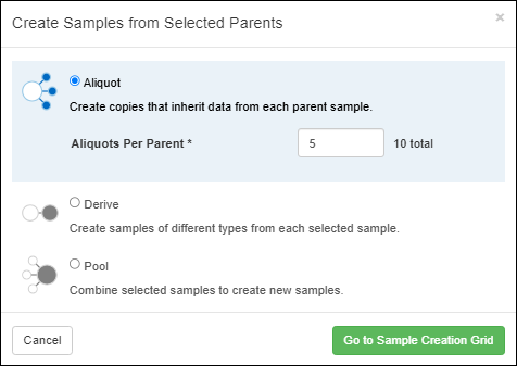 Select one or more Batches from the grid and choose Derive > Aliquot Selected.In the popup, as for creating sample aliquots, enter the number of Aliquots per parent to create, then click Go to Mixture Batch Creation Grid. Aliquots of mixture batches will be shown in the same grid as the original batch(es). Include the IsAliquot column in your grid view if you want to be able to filter for aliquots.