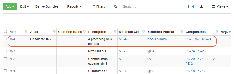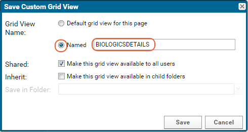 An administrator can create a special custom grid view to control the fields shown on an entity details page. If you create this special view using the Biologics interface, it will only show for your own user account. To make this change to the details view for all users, select > LabKey Server > [Your Biologics Project Name] to switch to the LabKey Server UI. Here you can save the "BIOLOGICSDETAILS" view and share it with all users.Customize the view for the entity type, then save it:
