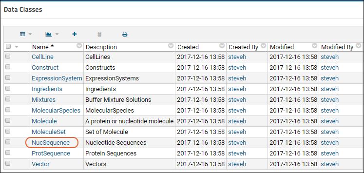 Click the name of the Data Class to edit, such as "NucSequence"
